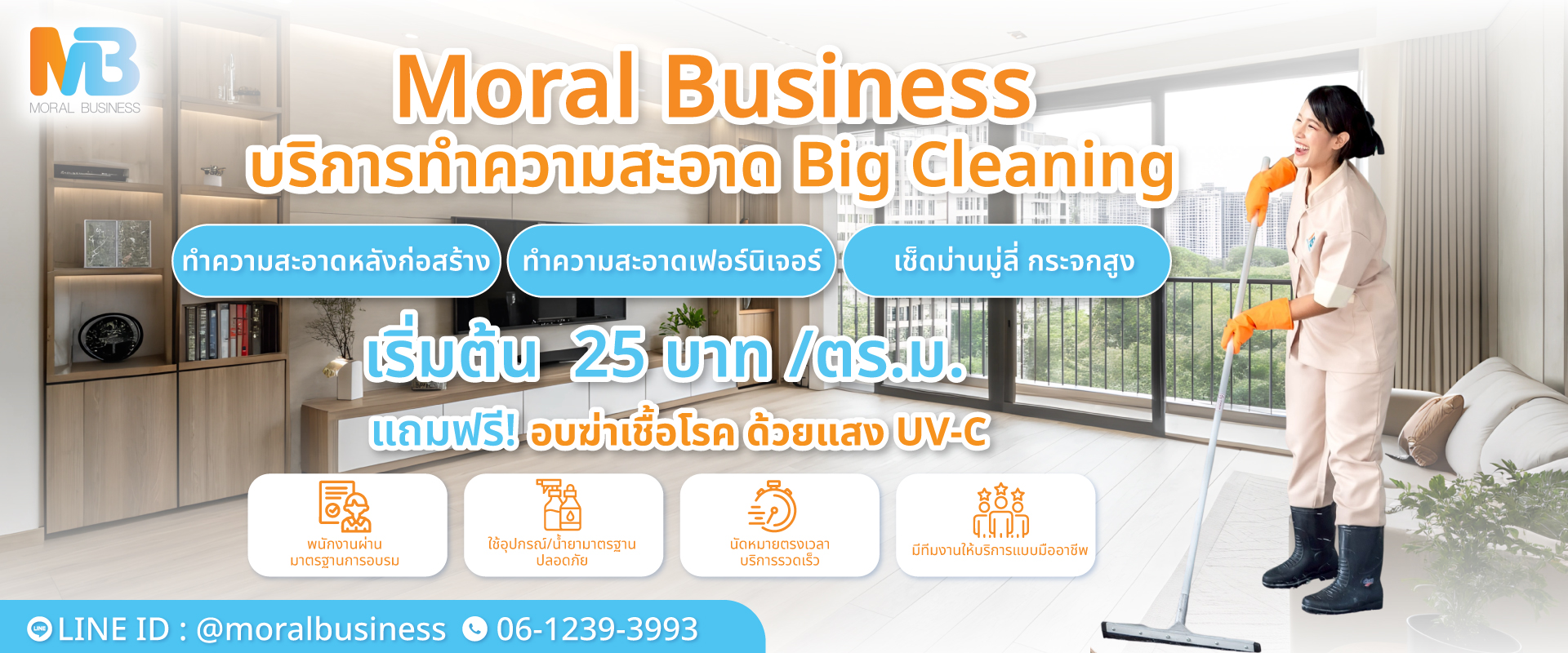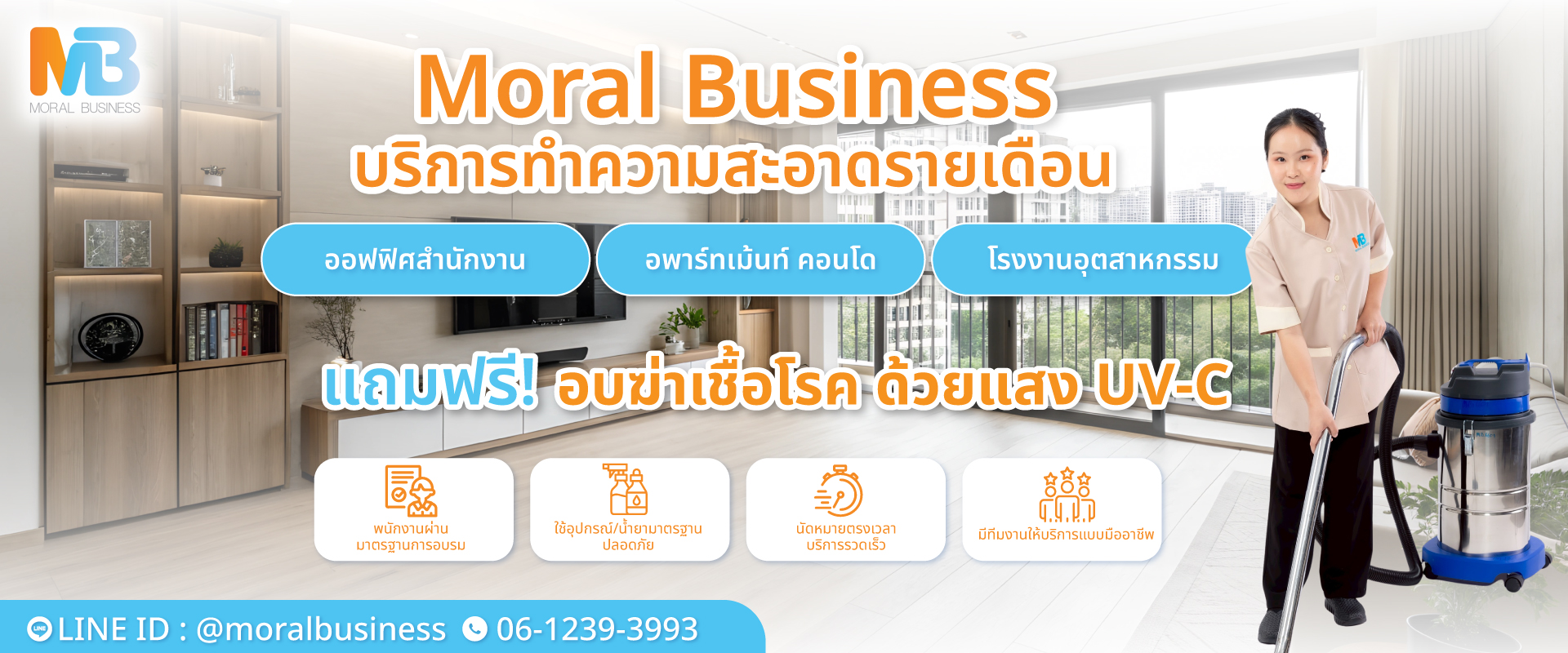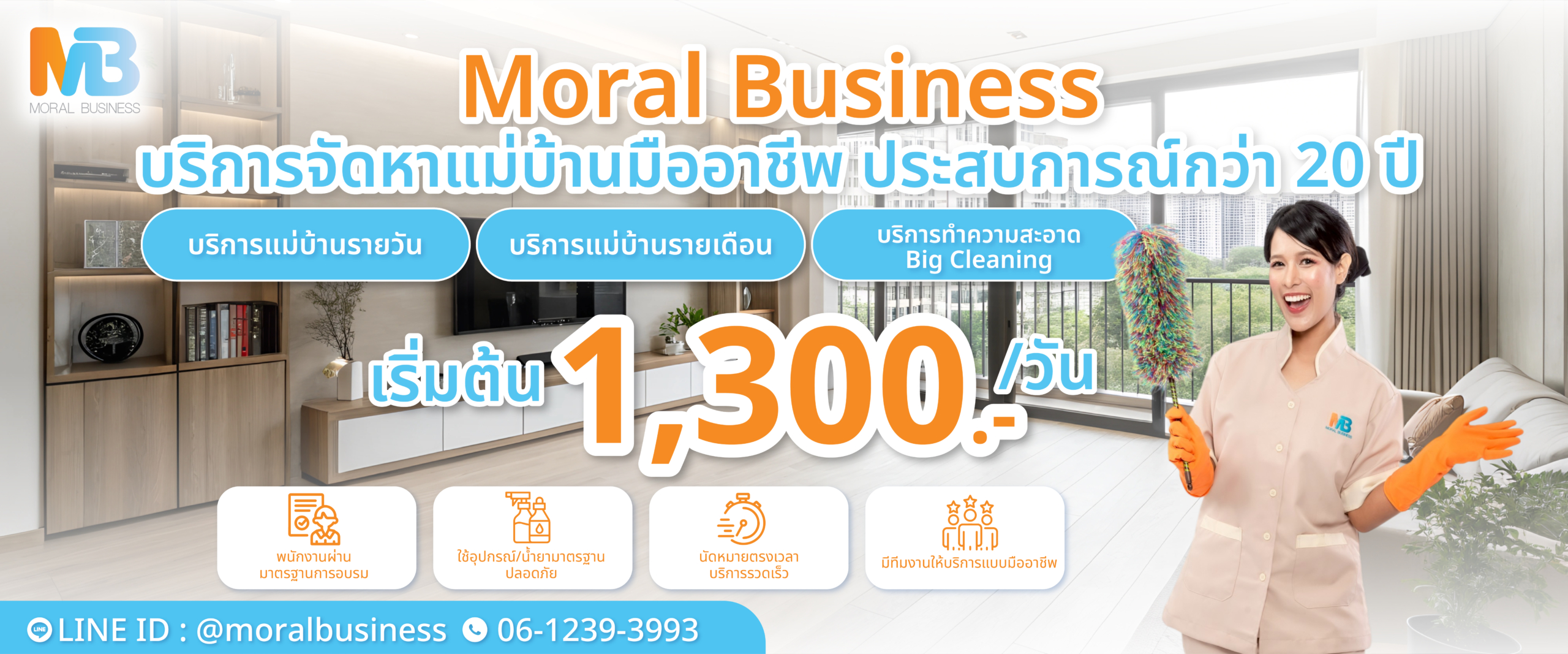 ด้วยประสบการณ์กว่า 20ปี บริษัทรับทำความสะอาด Moral Business เป็นผู้เชี่ยวชาญตัวจริงในธุรกิจบริการรับทำความสะอาด เน้นตอบโจทย์ความต้องการของลูกค้าครบวงจร บริษัทจัดหาแม่บ้านทำความสะอาดรายเดือน แม่บ้านรายวัน รับทำความสะอาดครั้งใหญ่ บิ๊กคลีนนิ่ง (Big Cleaning) ทำความสะอาดสำนักงาน โฮมออฟฟิศ รับทำความสะอาดคอนโด อพาร์ทเม้นท์ รับทำความสะอาดโรงงานอุตสาหกรรม สถานพยาบาล ร้านอาหาร